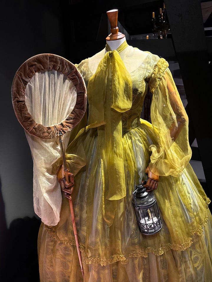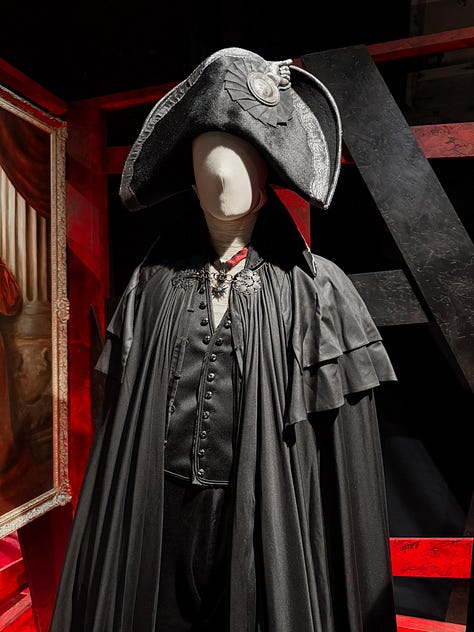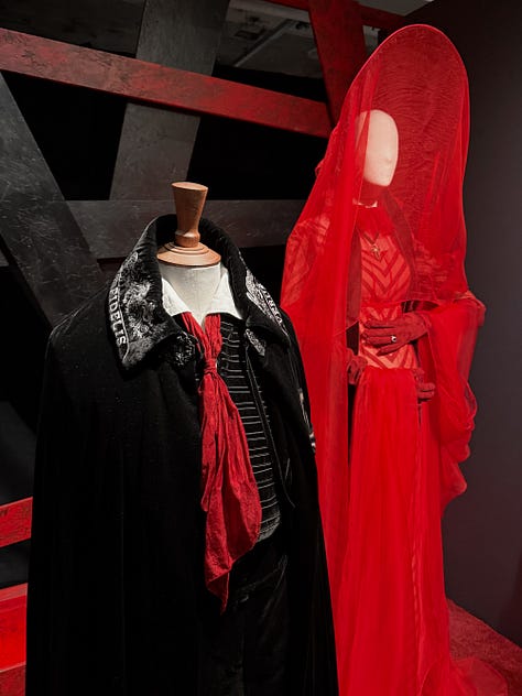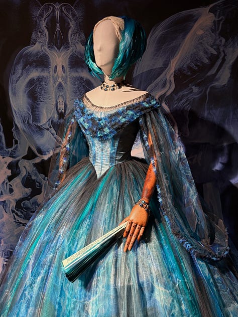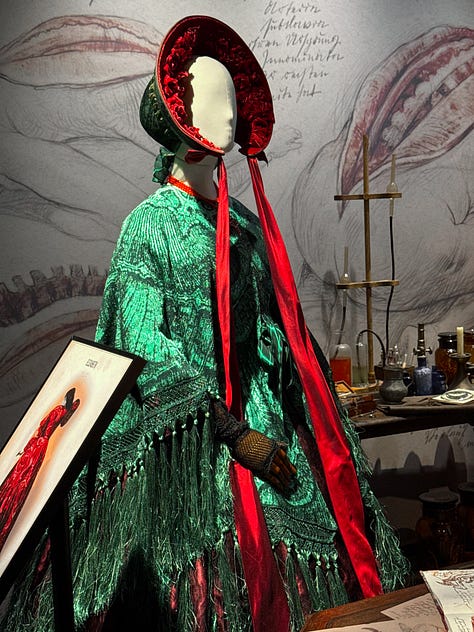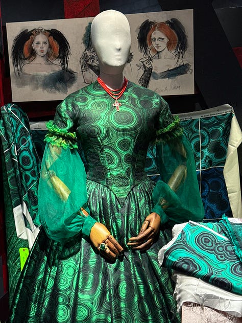 The exhibition was wonderfully immersive, featuring so much superbly imaginative artwork from the making of the film, as well as behind-the-scenes featurettes, and a stunning array of costumes. If there’s anything Guillermo del Toro excels at, it’s creating vibrant Gothic worlds for his films that get the understandably tricky task of balancing colour and darkness just right. His 2015 film “Crimson Peak” is a favourite of mine for this very reason; it proves that Gothic does not necessarily facilitate a monochrome palette (as much as I adore the monochrome look). All the ghosts and melodrama of “Crimson Peak” are just as gloomy when draped in deep red, vibrant teal, and rich gold lighting and costumes, and “Frankenstein” follows suit. The almost haemoglobin-esque patterns of some of the dresses reminded me of the typical endpapers on Victorian books. Needless to say, after the exhibition my enthusiasm reached new heights…