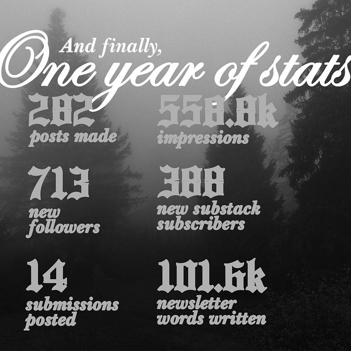 , we held our first giveaway, and continued building at this wonderful little world of ours. My own ten fingers eagerly typed over one hundred thousand words on the newsletter alone! Not to mention all your lovely submissions, contributions, and suggestions, to the Substack and beyond. If the society is my own creature, and you, my dear are the stitches or the lightning, I suppose that makes me Victor Frankenstein… An analogy with absolutely no latent troubles, none at all! Supposedly there are worse parallels to draw with classic literature… I rather enjoy electrifying my little lab, doing experiments, and playing god ❦.This year I read even more of your work, attended your plays and events, and donated to your bookshelves. What a joyous thing it is to run this cabinet of curiosities! All you wonderfully twisted kindred spirits are the best company one could ever ask for. For now, I leave you with this year’s overview of stats (I am a virgo after all), and a link to the timeline of the society. Small offerings to show my gratitude. Thank you, thank you, thank you for another year of love and violence. My study is admittedly more than a little cluttered right now, so don’t linger too long. There is much work to be done! Big things are coming, my dear, big things! It’s aliveee!