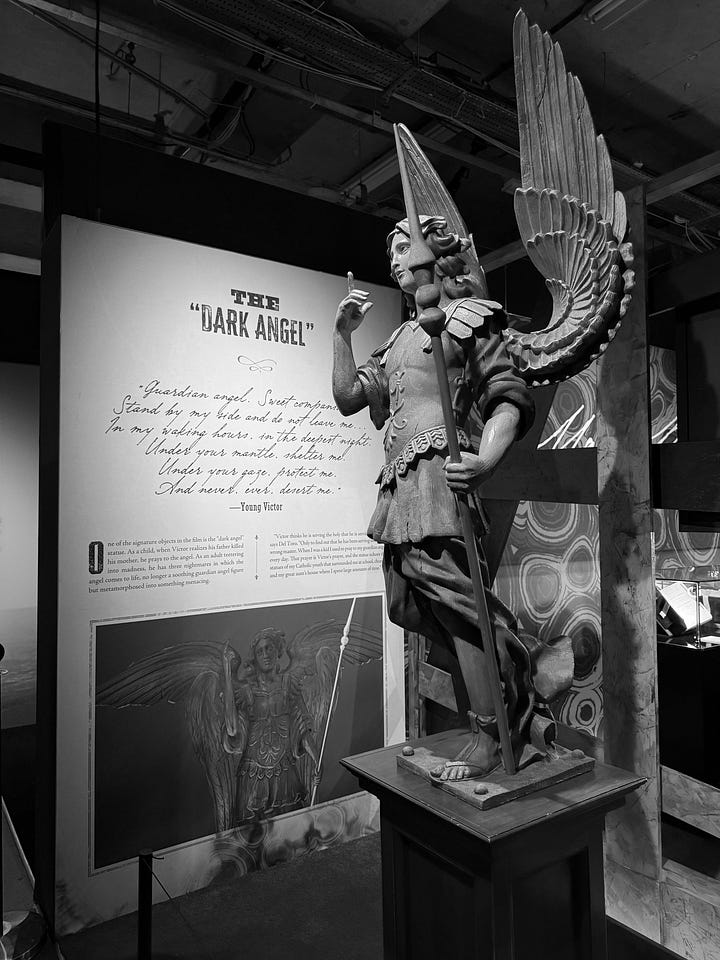 In intrepid anticipation of Guillermo del Toro’s “Frankenstein” (2025), that adaptation of Mary Shelley’s beloved novel, I simply had to head down to Selfridge’s to see the limited-time free “Frankenstein: Crafting a Tale Eternal” exhibition of the film’s artwork, costumes, and props. I was pleased to meet with another angel of death here: the “dark angel” statue from the film. Signs and symbols, my dear, are everything to the faithful.