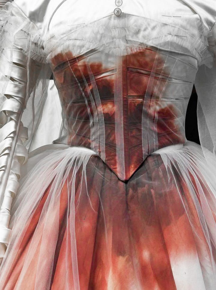 Starting our slow descent into madness, we must first examine the scene of the crime. There are a multitude of superstitions and symbols associated with the [Christian] wedding, especially the bride, and thus with bridal Gothic. Starting with the veil. The word itself carries a multitude of associations; people speak of the “veil” between life and death, to “unveil” means to reveal, veils are understood to be thin, gauze-like, tantalisingly transparent. The veil represents both the means both to cover up, as well as to reserve the possibility for uncovering. There’s a duality there, friction between intent and inevitable action— we will run into these multitudes again and again.